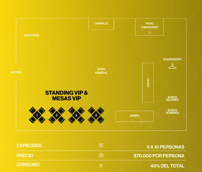 Incluye el 40% del precio de la mesa en consumo dentro del Club. Para clientes VIP servicio de botellas disponible.