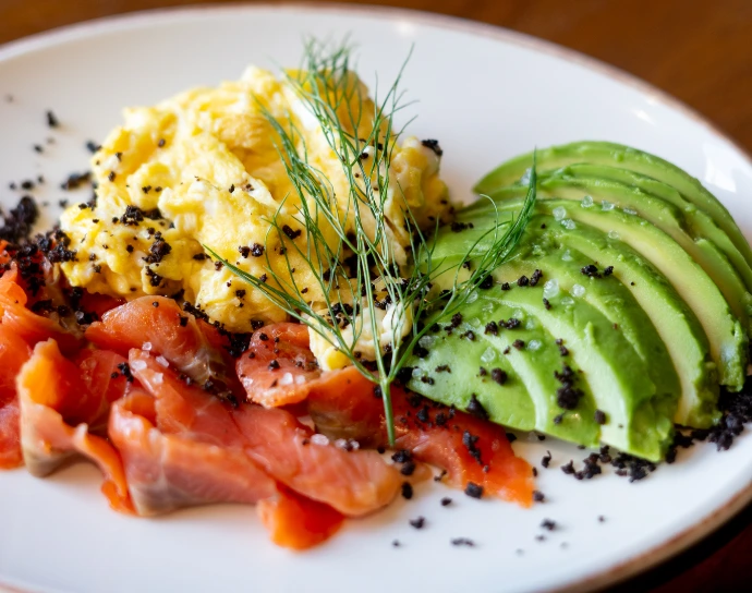 Huevos revueltos, polvo de aceituneas negras, media palta, gravlax de trucha salmonada.